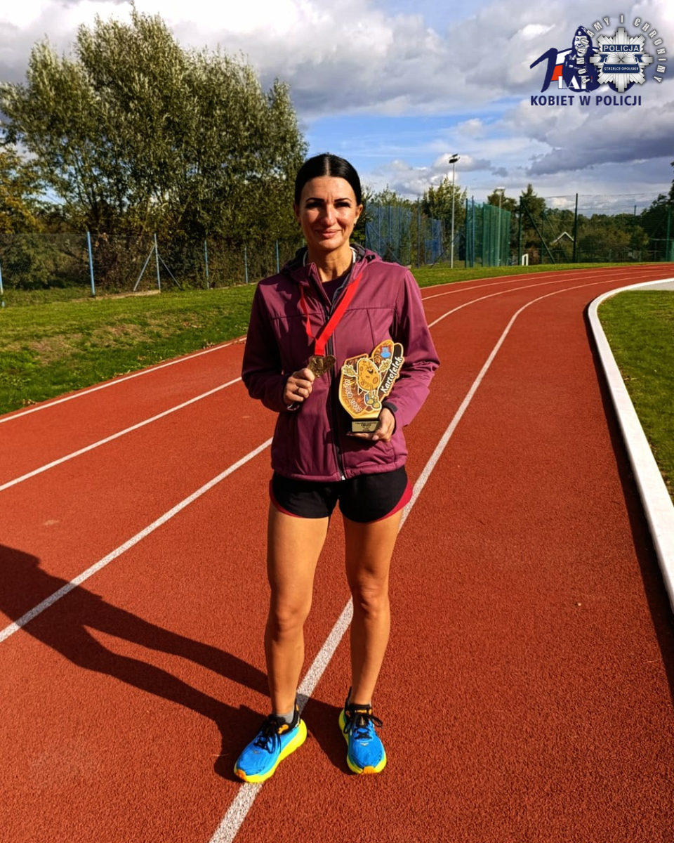 Sierż. szt. Justyna Szymczak ze strzeleckiej komendy Policji biega od zawsze – już w czasach szkolnych startowała w zawodach na krótkich dystansach. Choć później przerwy spowodowane macierzyństwem na chwilę odsunęły sport na dalszy plan, nigdy nie zrezygnowała z pasji. W 2020 roku rozpoczęła udział w biegach charytatywnych i sportowych wydarzeniach na terenie Opolszczyzny i Śląska, zdobywając liczne miejsca na podium. Od tego czasu pokonała już ponad 1000 kilometrów, a w tegorocznym półmaratonie opolskim uzyskała znakomity wynik – 1 godzina 55 minut.