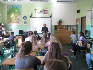 Mł.asp. Anna Kutynia z zespołu ds. profilaktyki społecznej, nieletnich i patologii strzeleckiej komendy przeprowadziła zajęcia z uczniami klasy czwartej z Publicznej Szkoły Podstawowej w Leśnicy. Policjantka doskonale radzi sobie z każdym zagadnieniem dotyczącym nieletnich i ich odpowiedzialności prawnej za popełniane czyny karalne. Mł.asp. Anna Kutynia zawsze służy dzieciom i młodzieży radą, pomocą i często bywa wsparciem w trudnych chwilach.